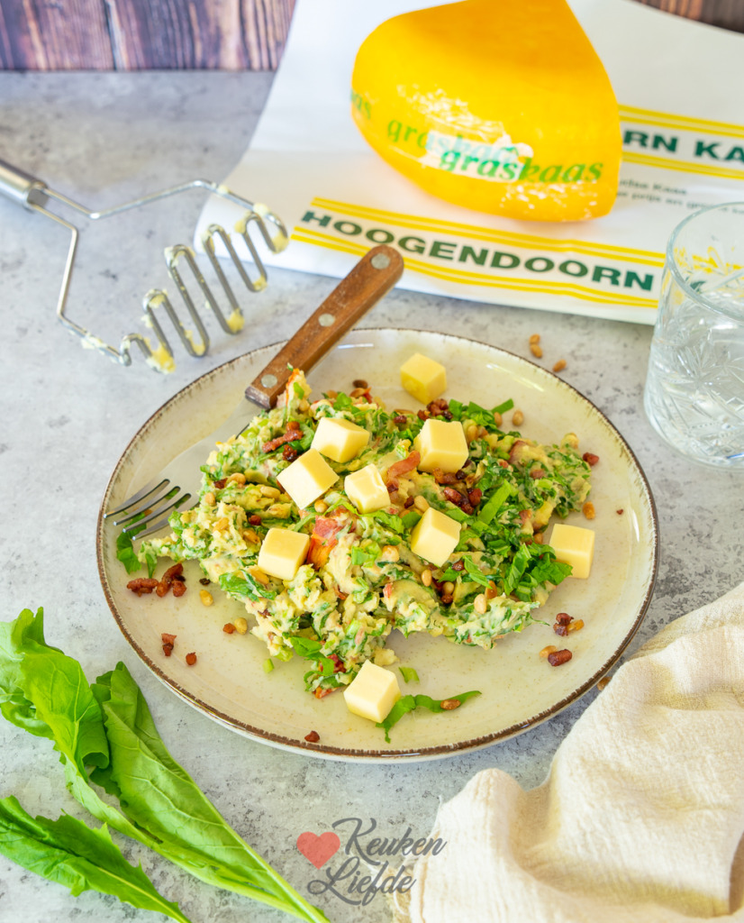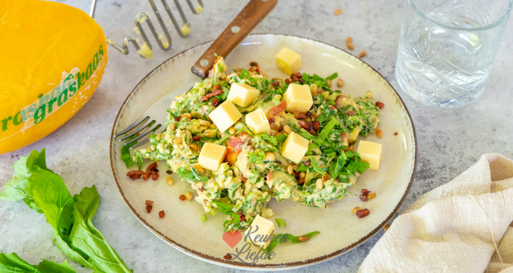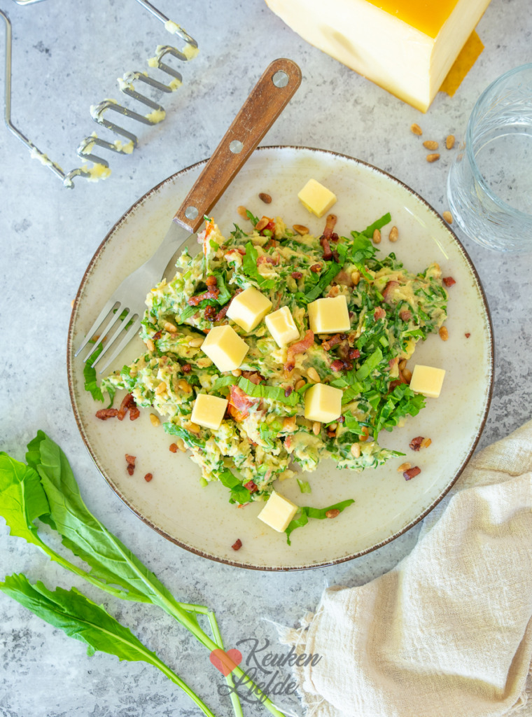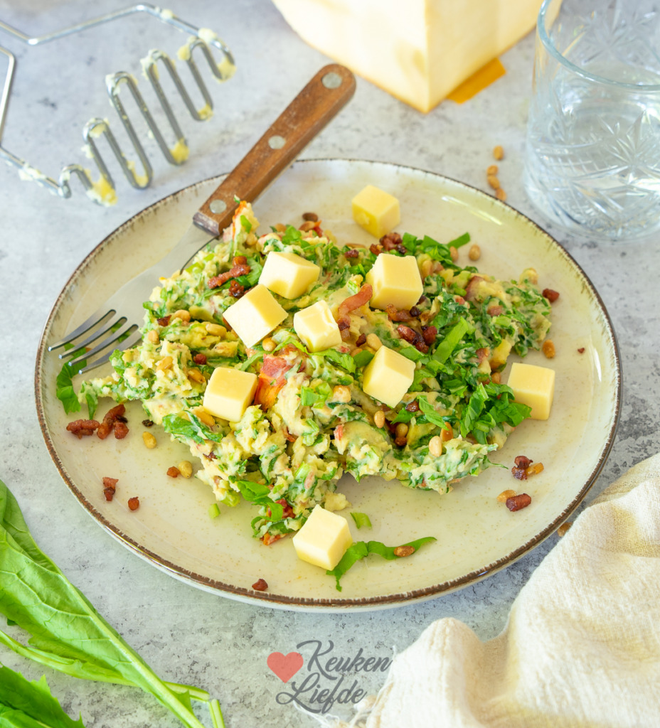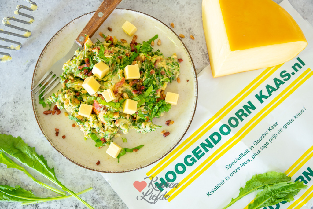 Een voorjaarsstamppot met raapstelen, graskaas en spekjes. Raapstelen zijn een voorjaarsgroente die je qua smaak een beetje kunt vergelijken met spinazie en rucola. De jonge, frisse blaadjes en steeltjes zijn knapperig en licht pittig van smaak. Als ik ze zie liggen in de winkel twijfel ik geen moment. Die gaan mee naar huis! Onlangs kreeg ik van Hoogendoorn Kaas een mooi stuk graskaas en ik besluit de raapstelen en graskaas samen te verwerken in een heerlijke voorjaarsstamppot. Met wat geroosterde pijnboompitjes en cherrytomaatjes geef ik er een heerlijke Italiaanse draai aan.