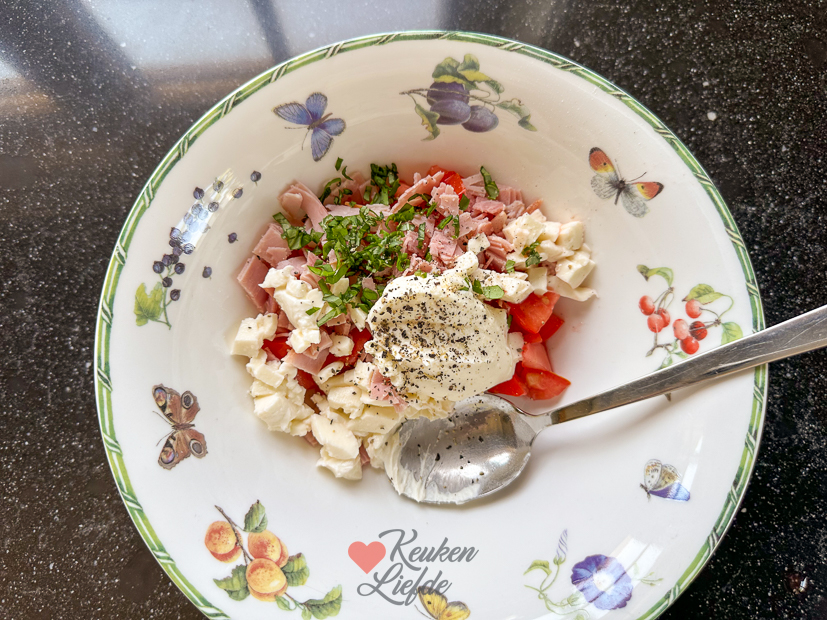 In plaats van mozzarella kun je ook andere kaas gebruiken zoals Goudse jong belegen.