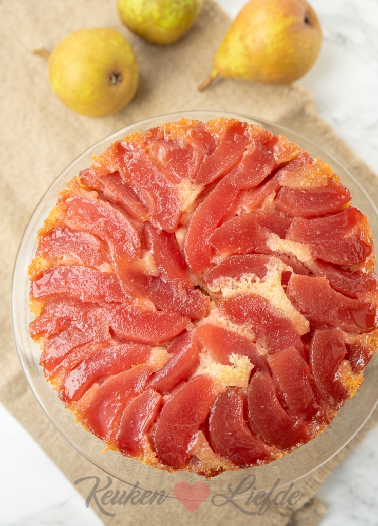 De eerste keer dat ik deze cake maakte haalde ik hem te vroeg uit de oven waardoor hij inzakte. Bij de tweede poging bakte ik hem een uur in de oven en lukte hij wel. De tweede keer waren de zelfgemaakte peren op en gebruikte ik stoofperen uit een pot. Vandaar het verschil tussen de bereidingsfoto’s en het eindresultaat.