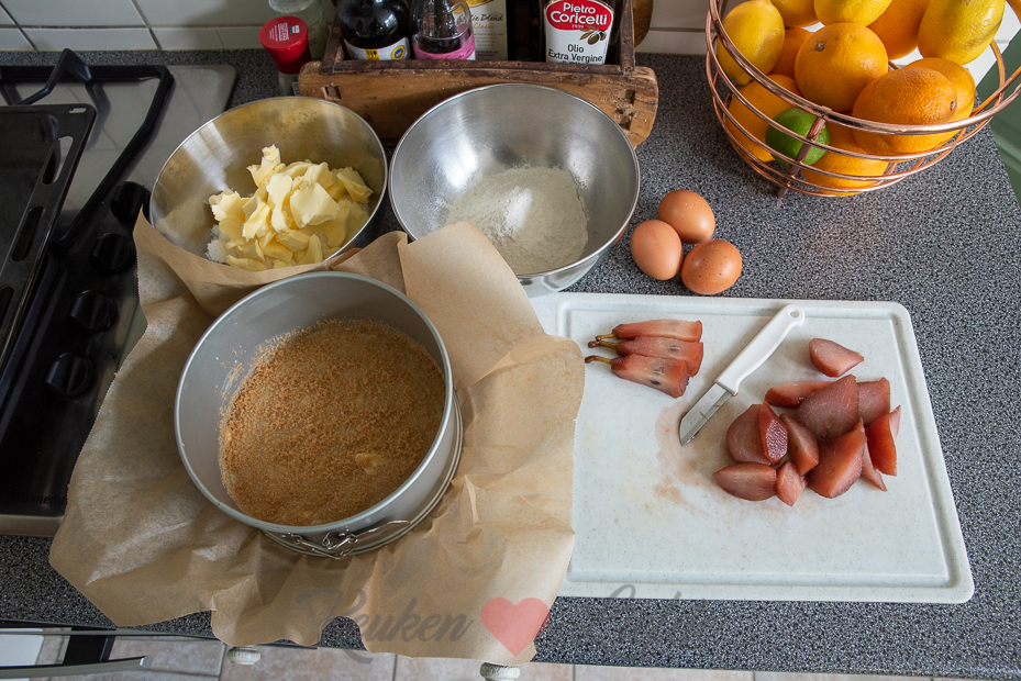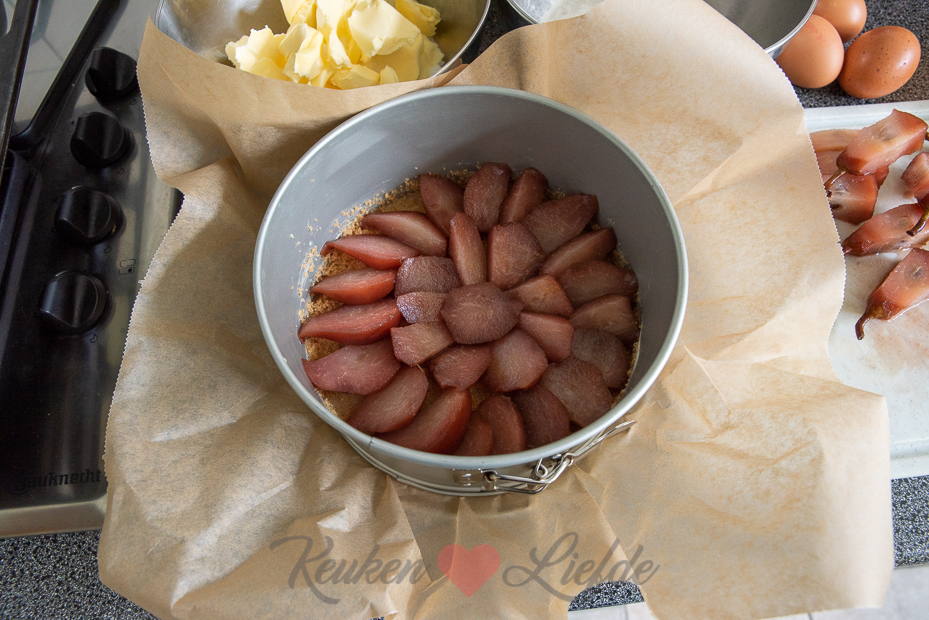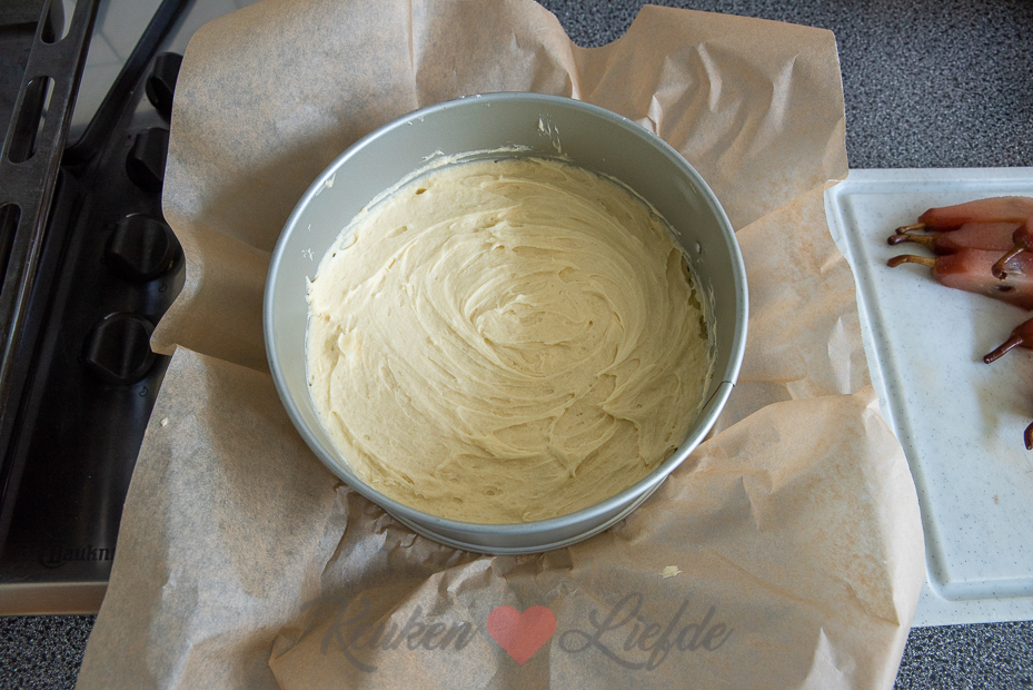 De eerste keer dat ik deze cake maakte haalde ik hem te vroeg uit de oven waardoor hij inzakte. Bij de tweede poging bakte ik hem een uur in de oven en lukte hij wel. De tweede keer waren de zelfgemaakte peren op en gebruikte ik stoofperen uit een pot. Vandaar het verschil tussen de bereidingsfoto’s en het eindresultaat.