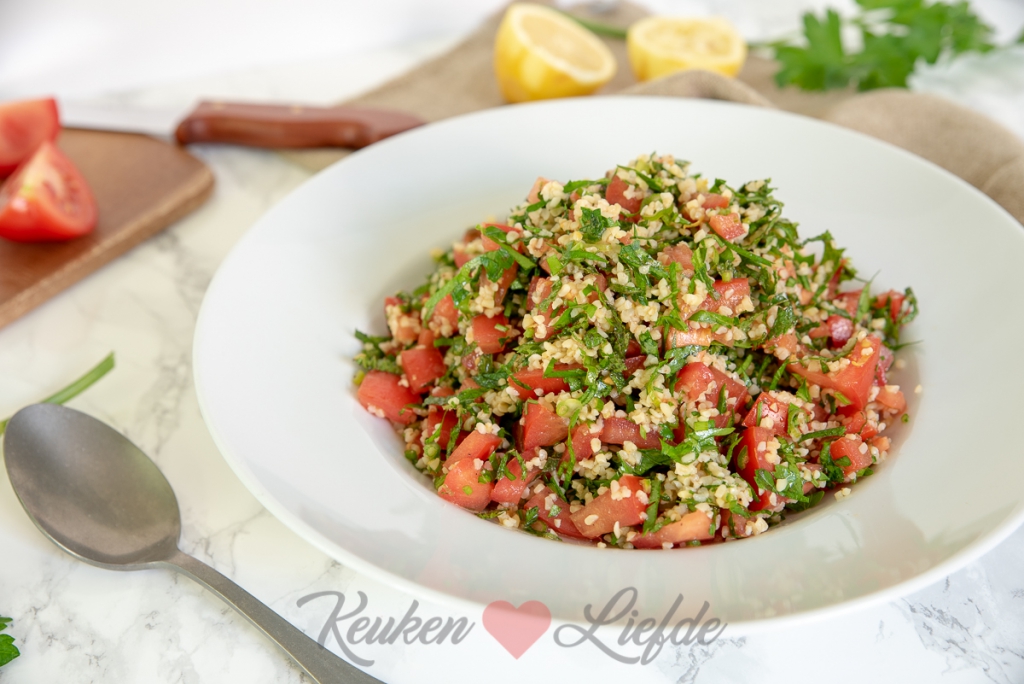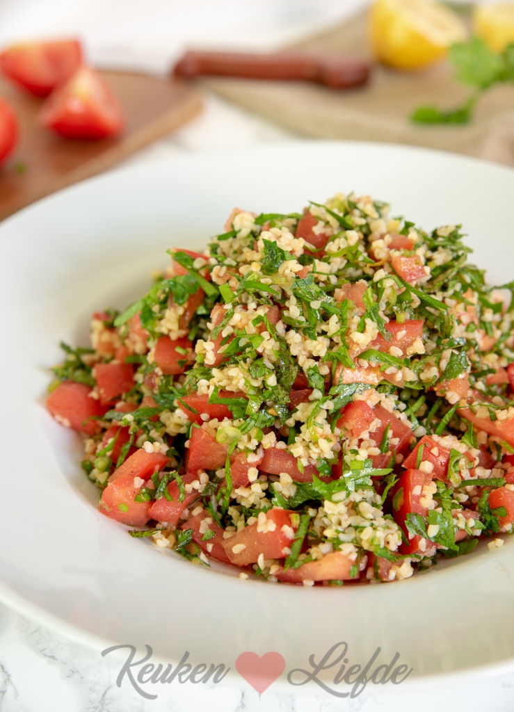 Eigenlijk is tabouleh een peterseliesalade, er gaat dus een flinke hoeveelheid peterselie in. In combinatie met de frisse munt, tomaat, ui, en citroen is dit gerecht een echte smaakmaker! Lekker om te serveren als voorgerecht of hapje met bijvoorbeeld flatbread of pita en hummus, neem mee naar je werk als lunch, of serveer als bijgerecht bij de barbecue. Met tabouleh kun je alle kanten op!