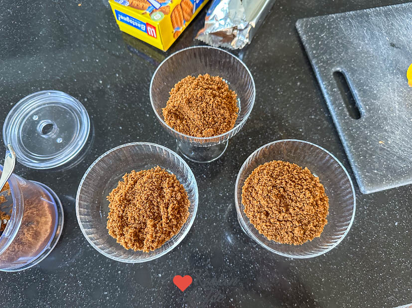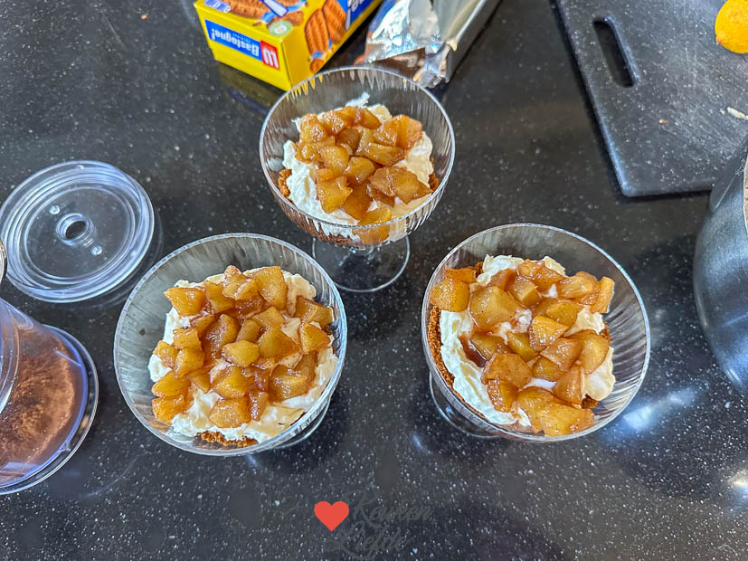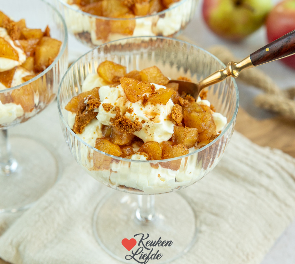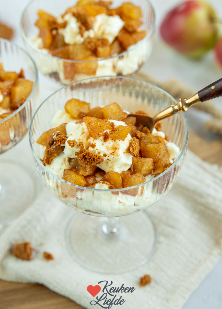 Een romig Monchou-toetje in een glaasje met gekarameliseerde appel en Bastogne kruimels. Een heerlijk toetje in een glaasje dat makkelijk is om te maken!