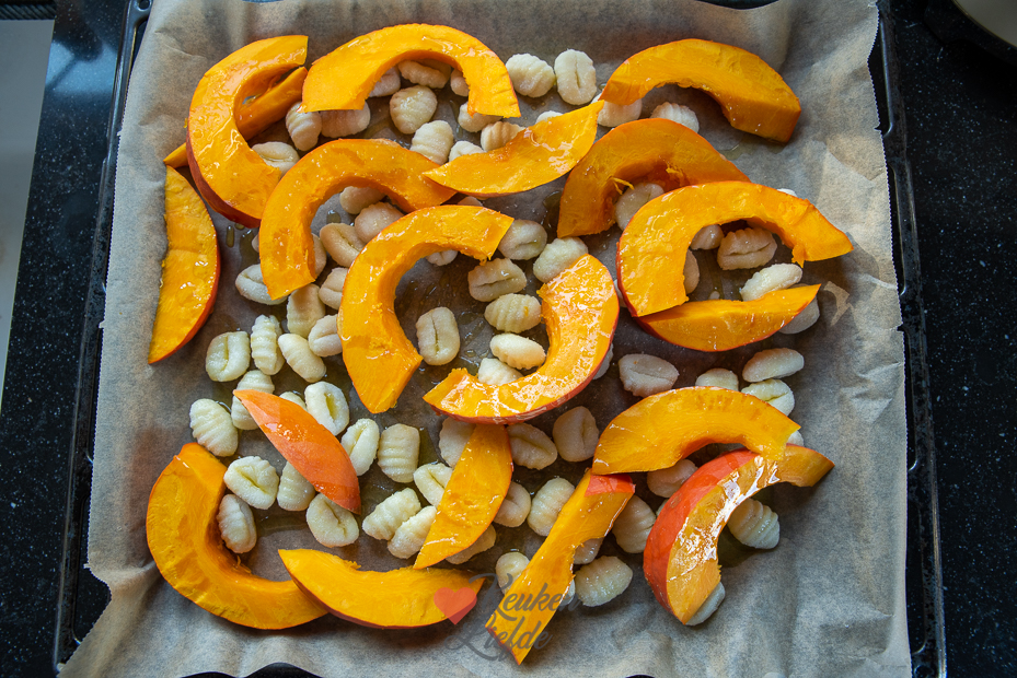 Voor het beste resultaat leg je de ingrediënten in een enkele laag op het bakblik. Dan bakt zowel de onderkant als de bovenkant goudbruin. Als je de groenten bovenop elkaar stapelt gaan ze smoren en laten ze meer vocht los. En dat is nu juist niet de bedoeling.