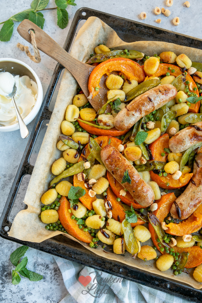 Deze heerlijke traybake is goed gevuld met gnocchi, pompoen, peulen, doperwtjes en saucijsjes. Een complete maaltijd dus. Met wat geroosterde hazelnoten, verse munt en een drizzle balsamicostroop maak je het smulfeest compleet. Ik serveer de traybake met een dot romige crème fraîche.