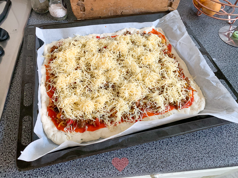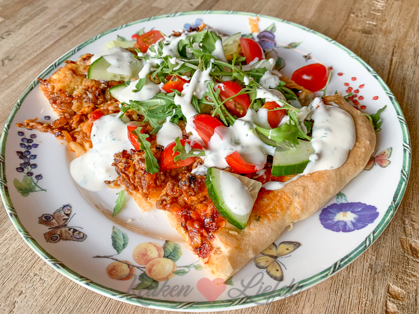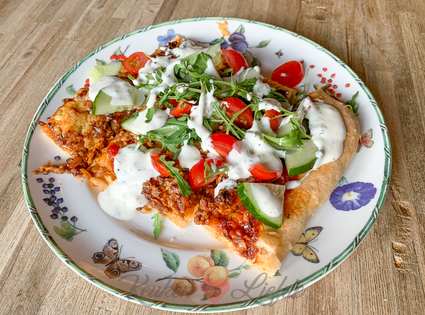 Een heerlijke Turkse pizza van het bakblik om te delen! De knapperige pizzabodem is belegd met gekruid gehakt en kaas en wordt voor serveren belegd met verse rauwkost en knoflooksaus. Voor een makkelijke en snelle variant kun je kant-en-klaar pizzadeeg gebruiken, of je maakt het deeg zelf. Moeilijk is het niet, maar wel erg lekker!