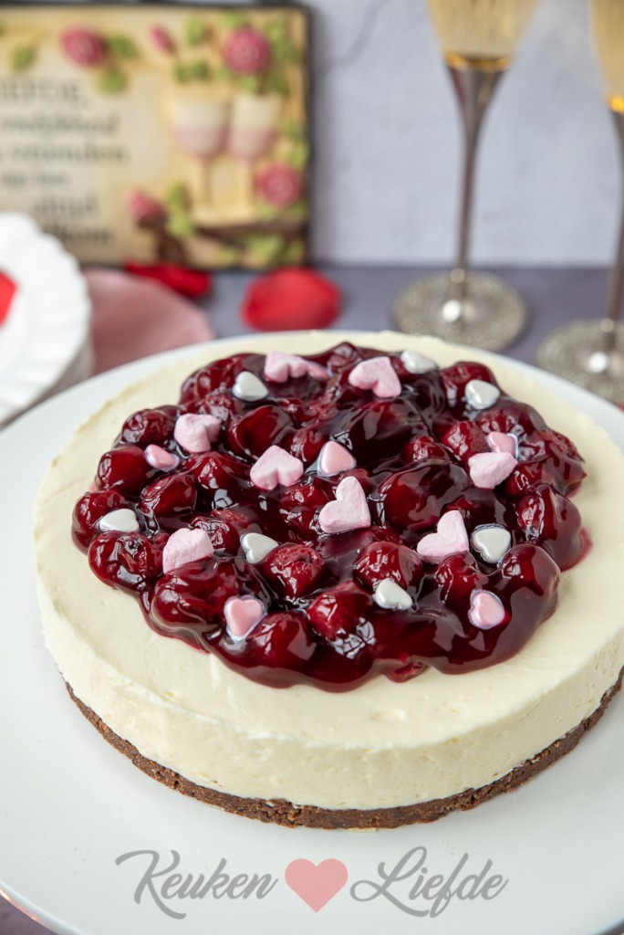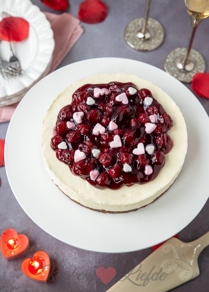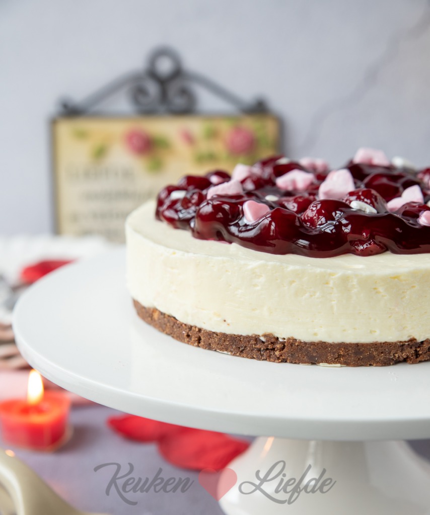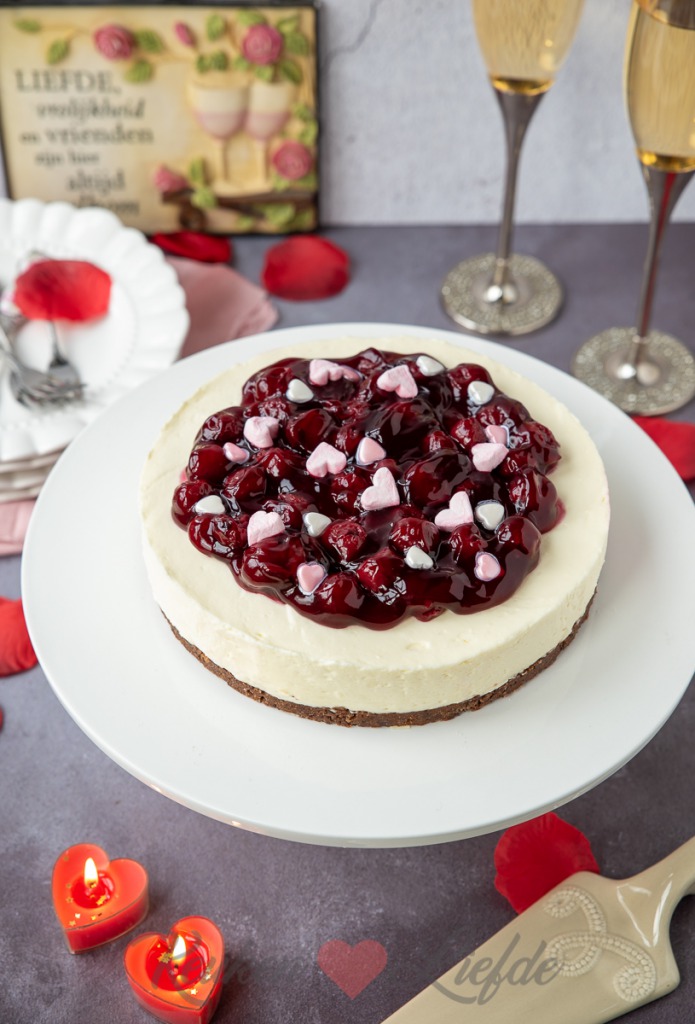 Verwijder voor serveren de springvorm. Snijd eerst met een mes de rand los voordat je de springvorm opent. Garneer vlak voor serveren met de eetbare Valentijns-lekkernijen.