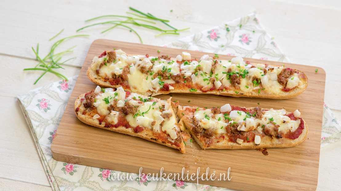 Bestrijk beide opengesneden kanten van het brood met de helft van de tomatensaus. Roer de overige tomatensaus door het gehakt en breng op smaak met zout en peper. Beleg de broodjes met de helft van de mozzarella, het rauwe gehakt, de ui en de overige mozzarella. Bak 8 tot 10 minuten in de oven, of totdat ze goudbruin zijn.