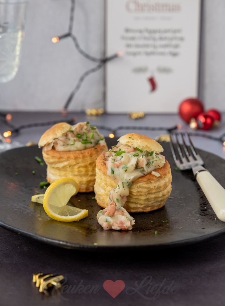 Voeg de Hollandse garnalen, dille en bieslook toe en warm kort even door. Schep de ragout in de pasteibakjes en serveer direct.