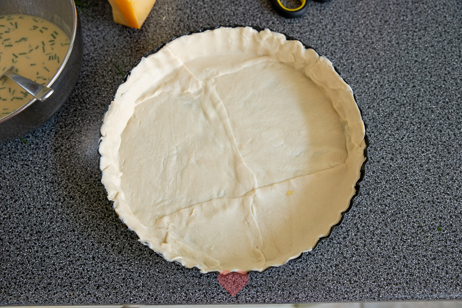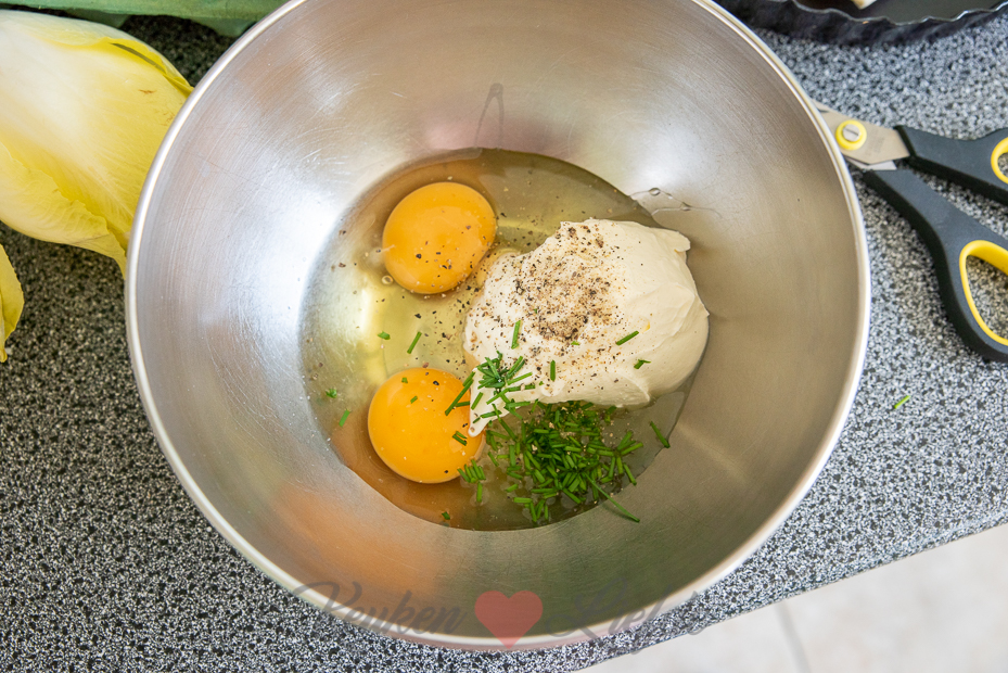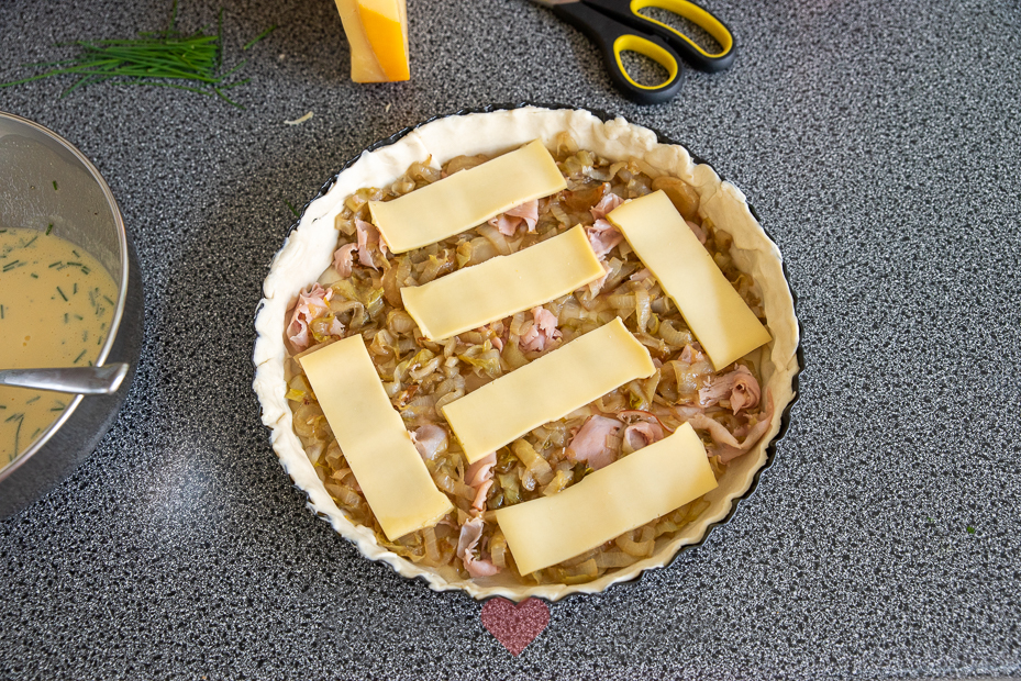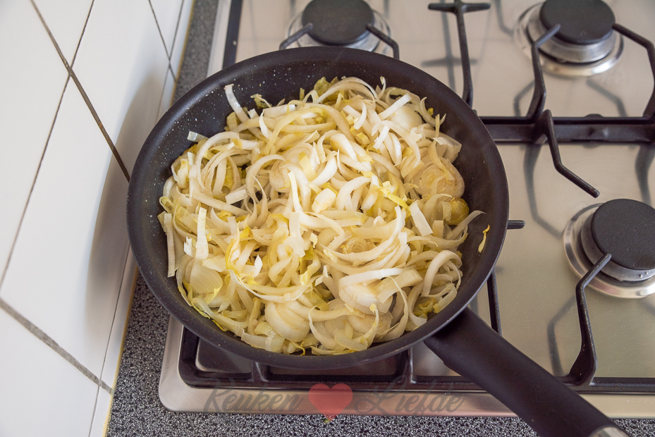 De witlof en ham worden eerst gebakken in de koekenpan voor een lekkere smaak. Daarna gaan ze samen met de romige eivulling en kaas in de bakvorm in de oven. Je kunt dit al voorbereiden en de quiche afgedekt in de koelkast bewaren. Voordat je wilt eten hoef je de quiche alleen maar af te bakken in de oven.