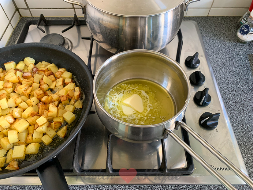 Voor de zelfgemaakte aspergesaus maak ik een roux (=boter-bloemmengsel) als basis, die ik bind met het aspergekookvocht. Zo krijgt de saus een heerlijke aspergesmaak. Door naderhand nog extra blokjes roomboter door de saus te kloppen, wordt de saus nog rijker en voller van smaak. Echt een aanrader en bovendien makkelijk om te maken!