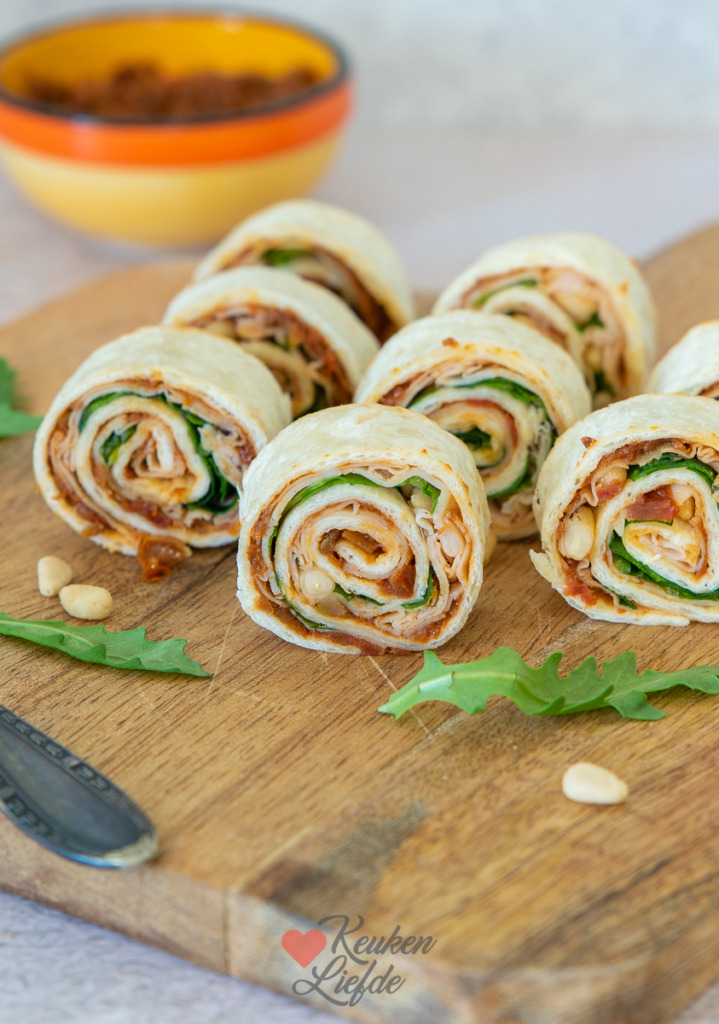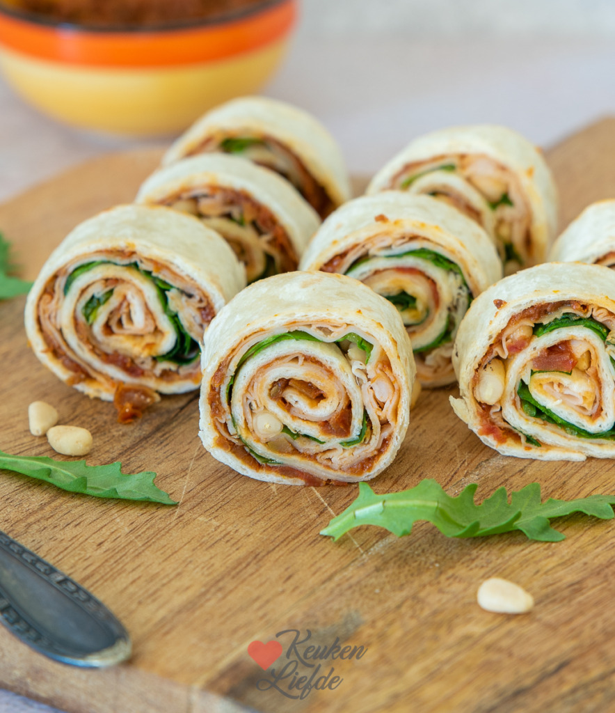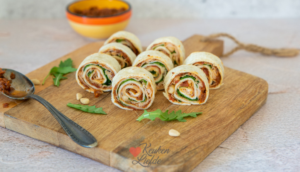 Wraprolletjes zijn het perfecte hapje om te serveren als je visite krijgt, of op een feestje of verjaardag. Op Keukenliefde vind je behoorlijk wat recepten voor wraphapjes en vandaag komt er weer eentje bij. Dit wraphapje met kip, tomatentapenade, rucola en pijnboompitjes is zo gemaakt en iedereen is er dol op.