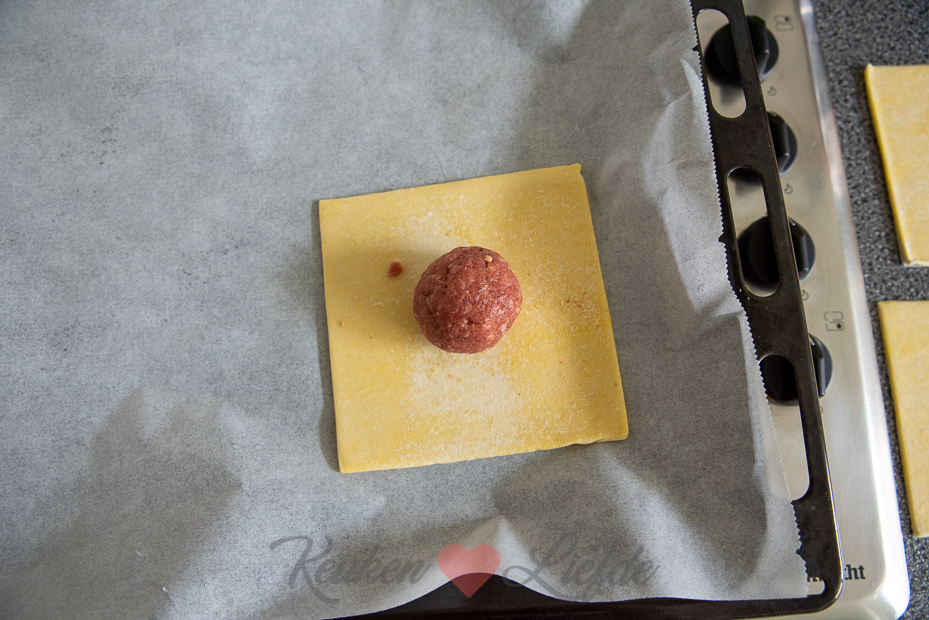 Laat de vellen bladerdeeg ontdooien. Doe ondertussen het gehakt en de overige ingrediënten in een kom en breng op smaak met zout en peper uit de molen. Kneed met je handen goed door. Draai 10 gehaktballetjes van het gehakt. Verwijder het folie aan de onderkant van het bladerdeeg.