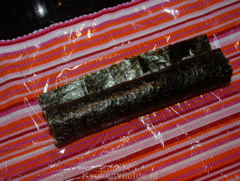 Het makkelijkste is om de rijst ’s ochtends of tot maximaal een dag van tevoren te maken. De sushirijst moet namelijk volledig zijn afgekoeld voordat je hem kunt verwerken. Wil je de sushi vullen met rauwe vis, bestel dan tijdig zalm of tonijn van sashimi kwaliteit bij je visboer. Dat is hele verse vis die je veilig rauw kunt eten. Voorverpakte zalm of tonijn uit de supermarkt is dat niet. Wil je toch zalm of tonijn uit de supermarkt gebruiken (doe ik zelf heel vaak), gaar hem dan eerst voor in de oven (zie uitleg bij ingrediënten).