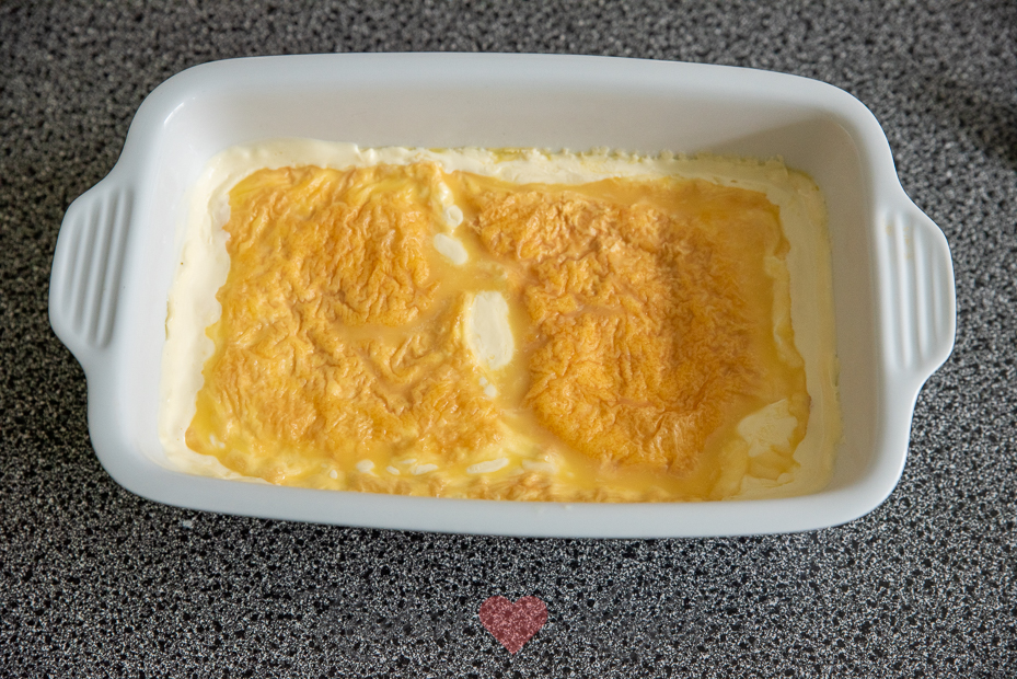 - Kleine ovenschaal, mijn ovenschaal is 9,5×18 cm (binnenmaat van de bodem gemeten), eventueel iets kleiner kan, maar niet groter