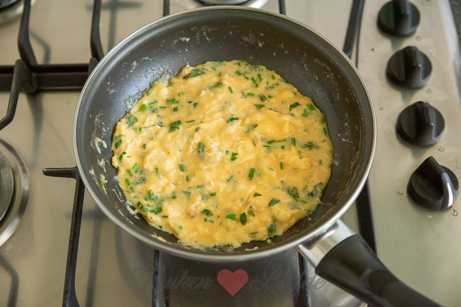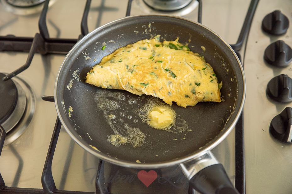 • Haal de pan van het vuur als de omelet nog net niet helemaal gestold is en laat hem nog even nagaren. Zo wordt hij perfect gaar!