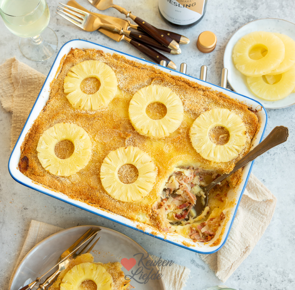 Een heerlijke zuurkoolschotel met laagjes aardappelpuree, zuurkool en beenham. Met paneermeel bestrooid voor een krokant korstje. De ananas bovenop geeft een heerlijk friszoet accent.