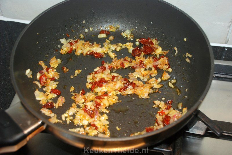 Verhit een hapjespan met wat zongedroogde tomatenolie en fruit de ui en zongedroogde tomaat op laag vuur, totdat de ui zacht is.