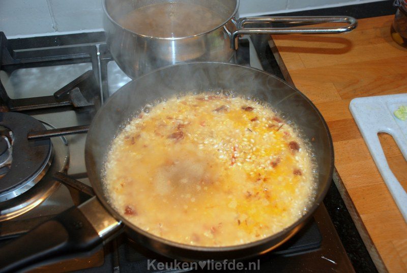 Roer dan de risottorijst erdoor en bak kort even mee. Voeg zoveel bouillon toe, totdat de rijst net onder staat en roer even door.
