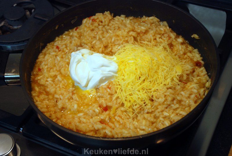 Kook de risotto op laag vuur onder voortdurend roeren gaar, voeg steeds opnieuw bouillon toe als het vorige bijna is opgenomen. De rijst mag niet droog komen te staan. Wanneer de rijst beetgaar is, roer je alle overige ingrediënten door de risotto.