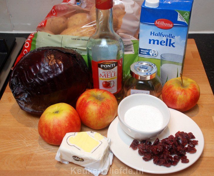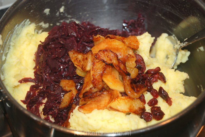 Roer de warme rodekool, gebakken appel (houd eventueel wat achter voor garnering) en cranberry’s door de puree.