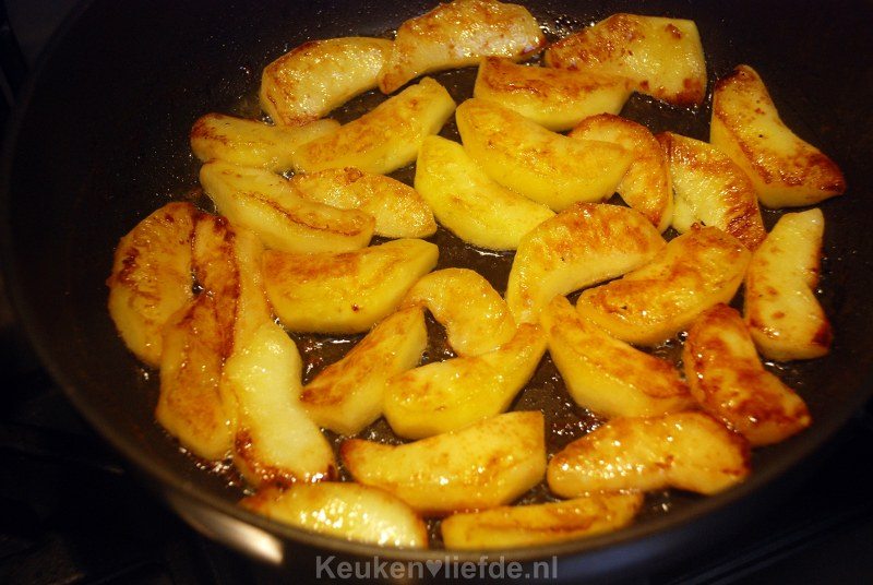 Schil de appels, verwijder het klokhuis en snijd de appels in dikke plakken. Verhit een koekenpan met wat boter en bak de appelpartjes op hoog vuur goudbruin.
