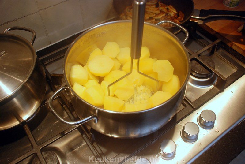 Verwarm de melk en de boter in een steelpannetje, of in de magnetron, totdat de boter net gesmolten is. Giet de aardappels af en stamp ze fijn.