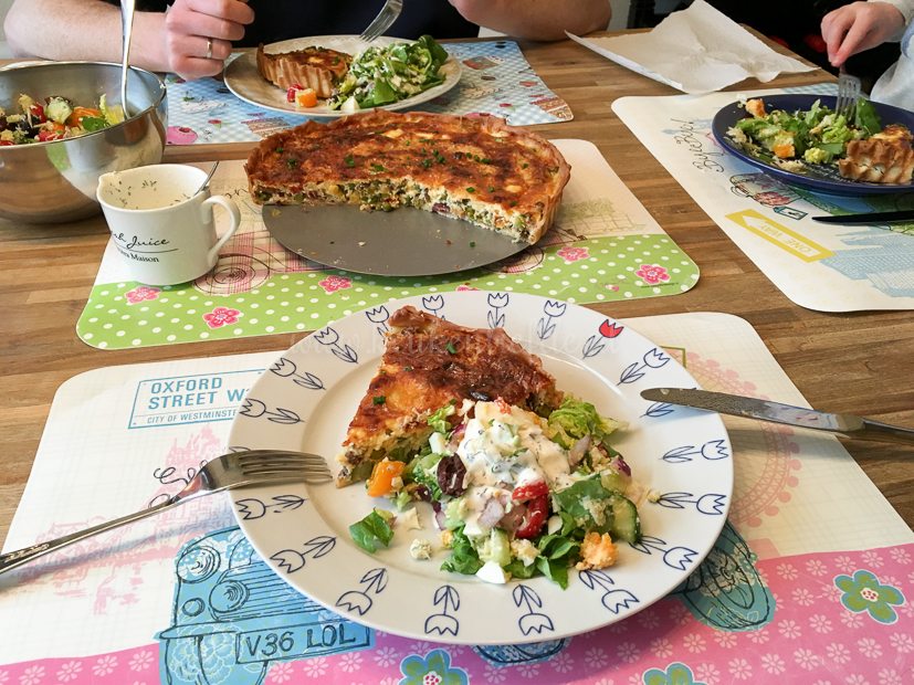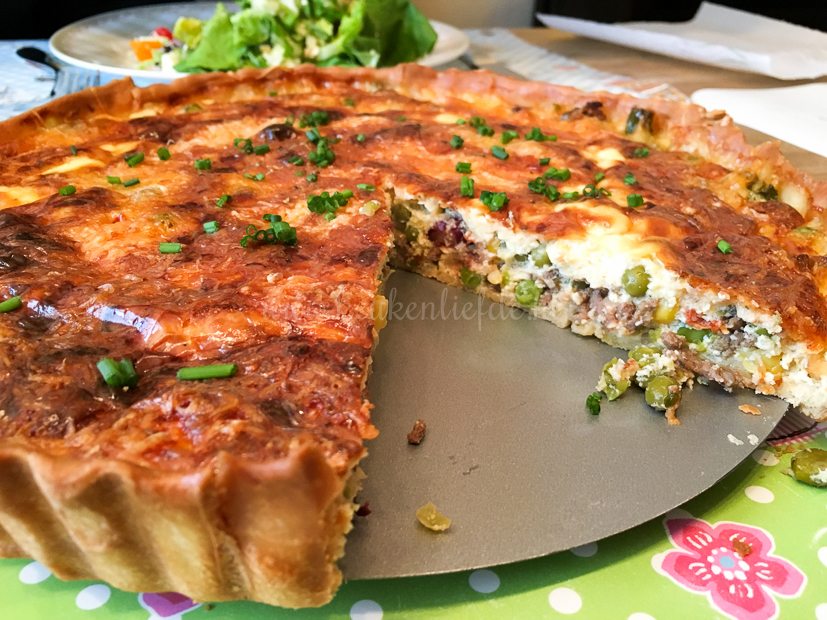 Voor het avondeten maak ik een lekkere quiche met kliekjes gekookte groenten en restjes gebraden kip. Johan maakt er nog een salade bij. Feestmaal!
