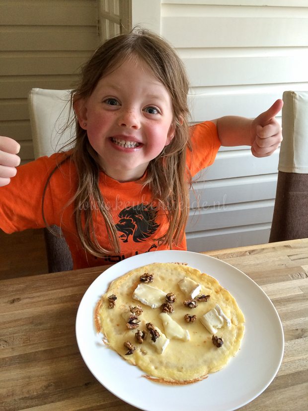 Maar het hoogtepunt van de dag zijn voor Ella-Marie toch wel de zelfgebakken pannenkoeken met brie, walnoten en honing die ik bak als we weer thuis zijn.