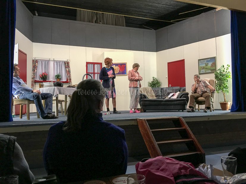 We eten pizza (dit keer geen zelfgemaakte, maar wel zelfbelegd) en gaan daarna kijken bij de toneeluitvoering van de oranjevereniging Kerk-Avezaath. Mijn schoonmoeder speelt al jaren mee en ze is echt goed!