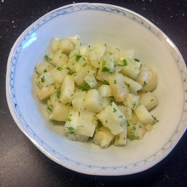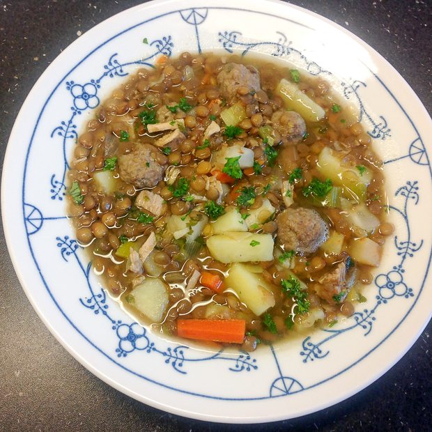 Mijn moeder stuurt me deze foto’s door van linzensoep en knolselderijsalade. Haha, als ze niet in de aarde aan het wroeten is, staat ze wel in de keuken.