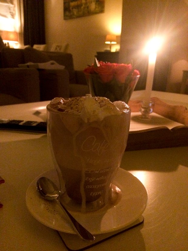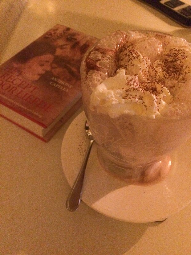 ’s Avonds kruip ik met een mok warme chocolademelk met slagroom en de roman Het recept voor liefde van Anthony Capella op de bank.