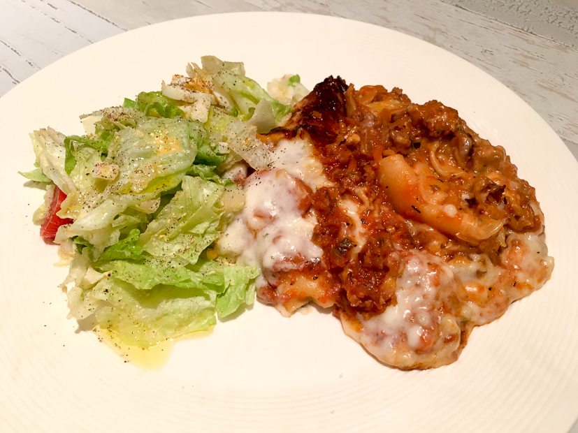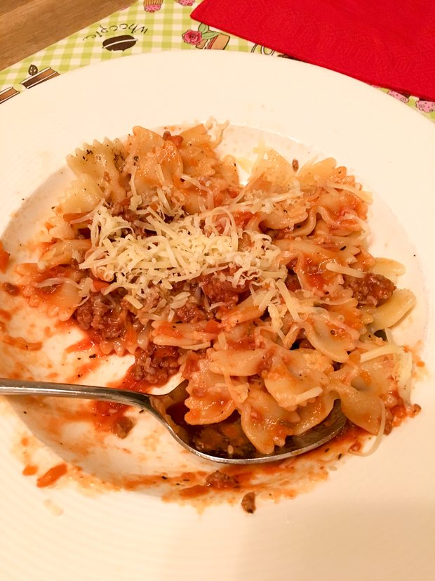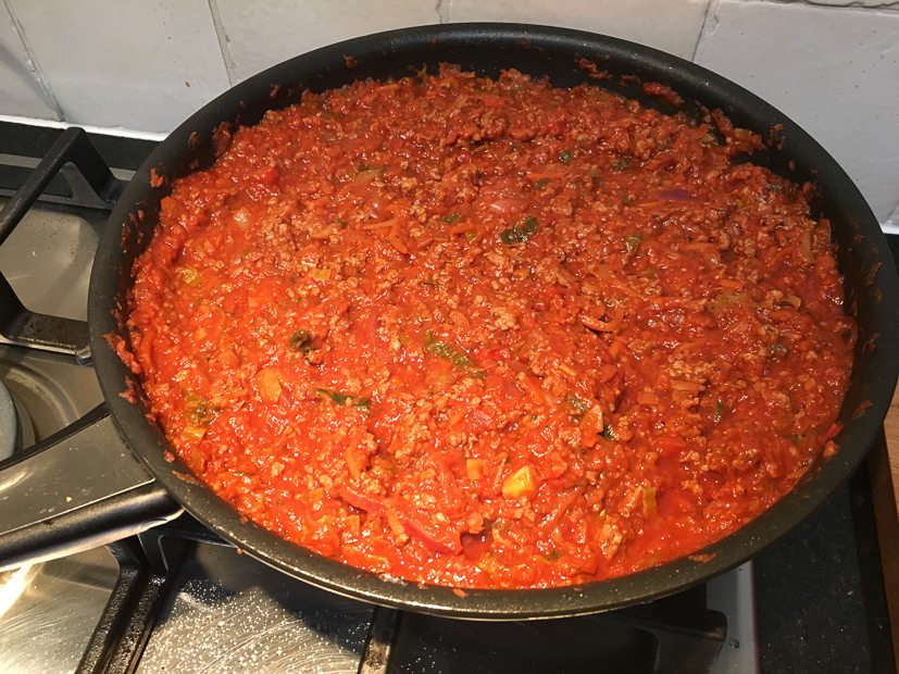 Ella-Marie eet ’s avonds een bordje pasta bolognese en Johan en ik eten lasagne. De andere schaal lasagne gaat lekker in de koelkast.