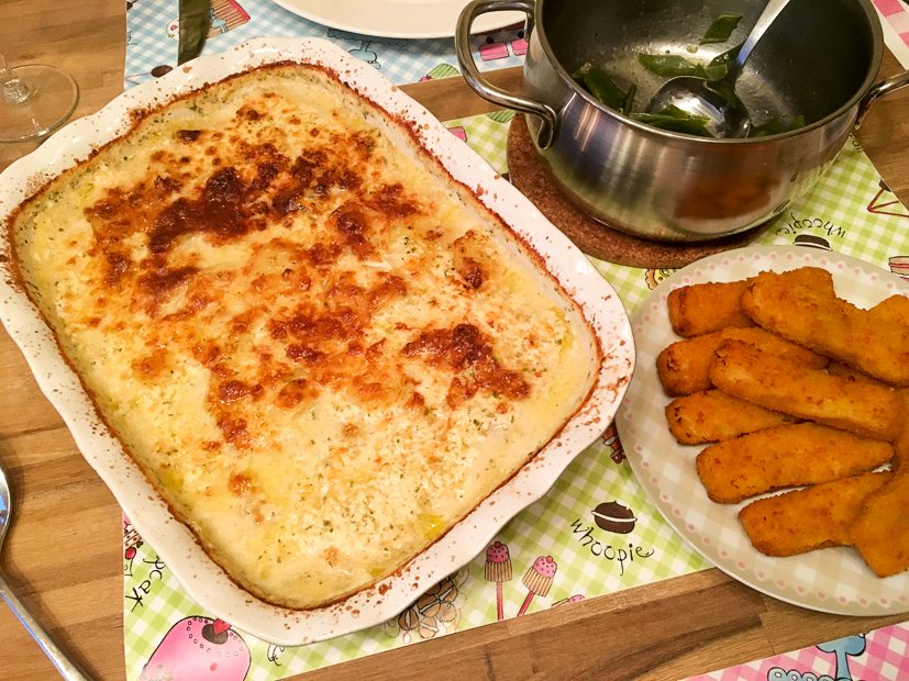 Hij is supergoed gelukt! Ik moet het recept nog iets finetunen — de saus was nog iets te dun — maar ik beloof hem binnenkort met je te delen. Ik serveerde er visstick en snijbonen bij.