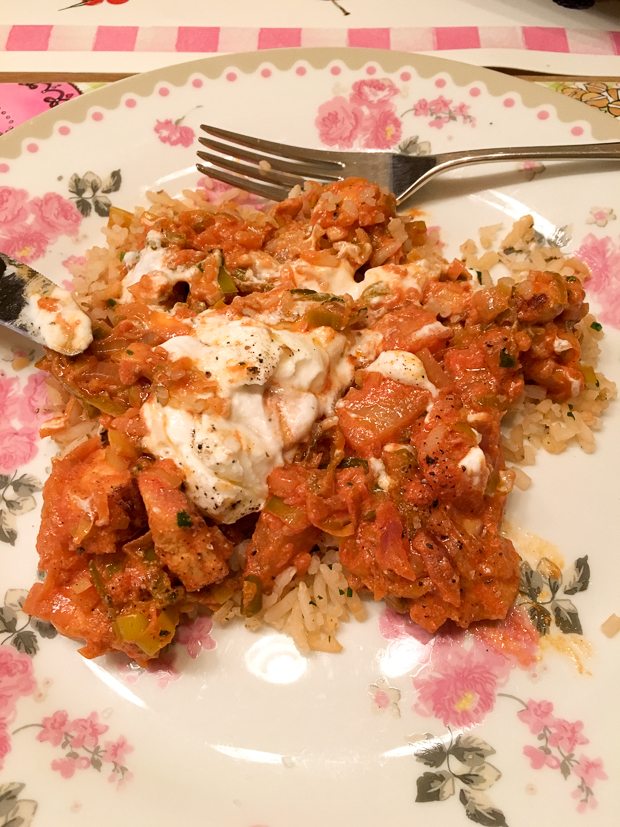 Hij is supergoed gelukt! Ik moet het recept nog iets finetunen — de saus was nog iets te dun — maar ik beloof hem binnenkort met je te delen. Ik serveerde er visstick en snijbonen bij.