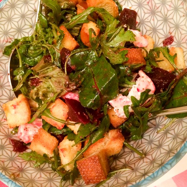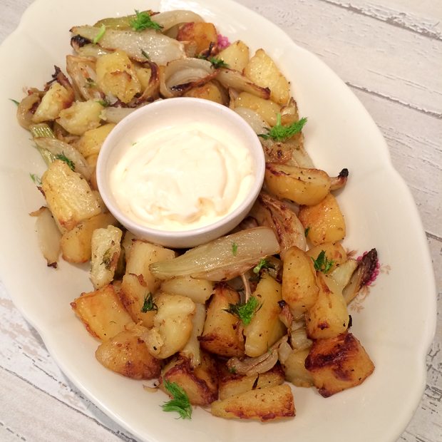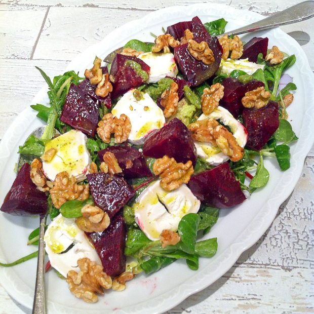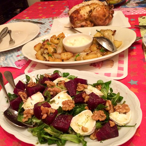 Tijdens mijn Newcastle-tripje vorig jaar oktober genoot ik van een waanzinnig lekkere lunch bij de Cook House. Sindsdien was ik vastberaden een soortgelijke lunch zelf te maken en besluit dat vandaag de dag is. Op het menu staat een hele gebraden kip met crème fraîche en dragon, aardappels en venkel uit de oven met aïoli en een salade met bietjes, geitenkaas en walnotenpesto. Missie geslaagd, het was wáánzinnig lekker!