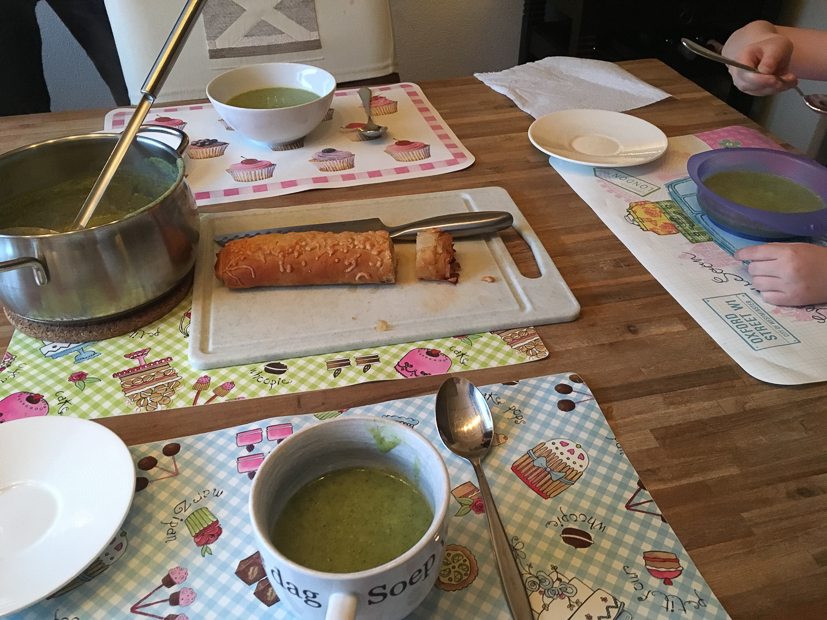 ’s Avonds eten we weer soep. Haha! Ik had nog broccoli- en tomatensoep over.