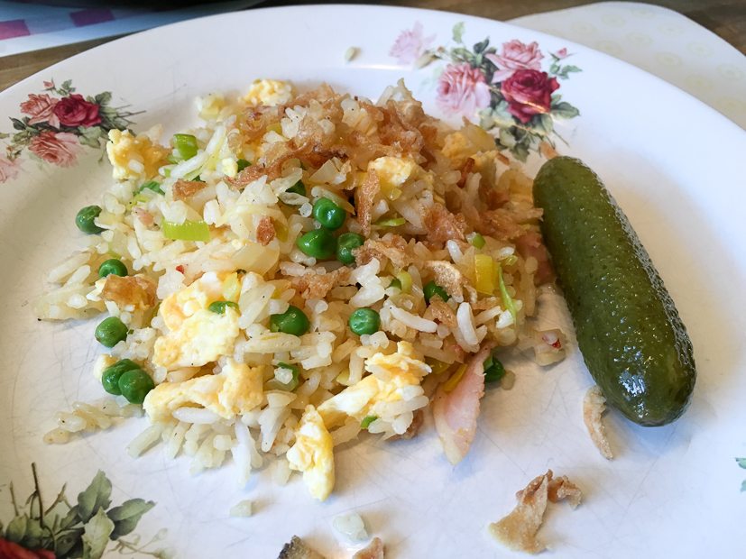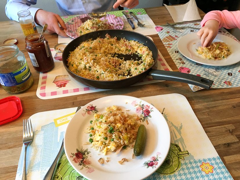 We eten ’s avonds thuis met een kliekje nasi van gisteren.