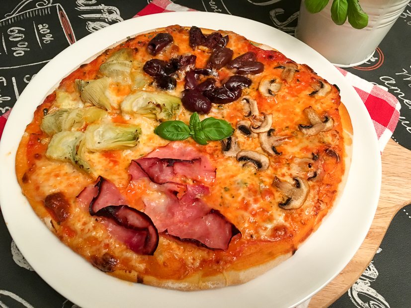 ’s Avonds eten we zelfgemaakte pizza. Ella-Marie mag haar eigen pizza beleggen. Johan en ik gaan dit keer voor quattro stagioni. Heel erg lekker!