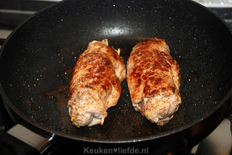 Rol de schnitzels zo strak mogelijk op. Steek de schnitzels vast met een houten prikker.