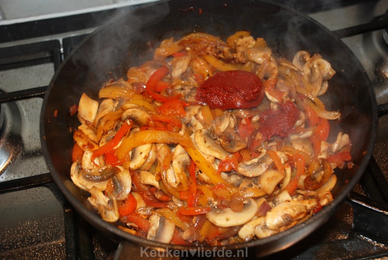 Bak in hetzelfde braadvet de ui totdat hij zacht is. Voeg dan de paprika, knoflook, paprikapoeder en marjolein toe en bak een minuut verder. Breng op smaak met zout en peper. Voeg de tomatenpuree toe, bak even kort mee en blus af met een flinke scheut Madeira.