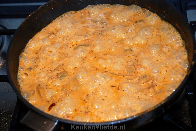 Laat de Madeira even inkoken en voeg dan de bouillon en slagroom toe. Zet het vuur laag en laat de saus zachtjes pruttelen totdat hij de gewenste dikte heeft.