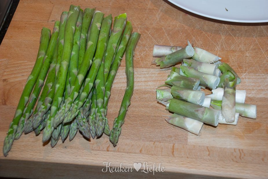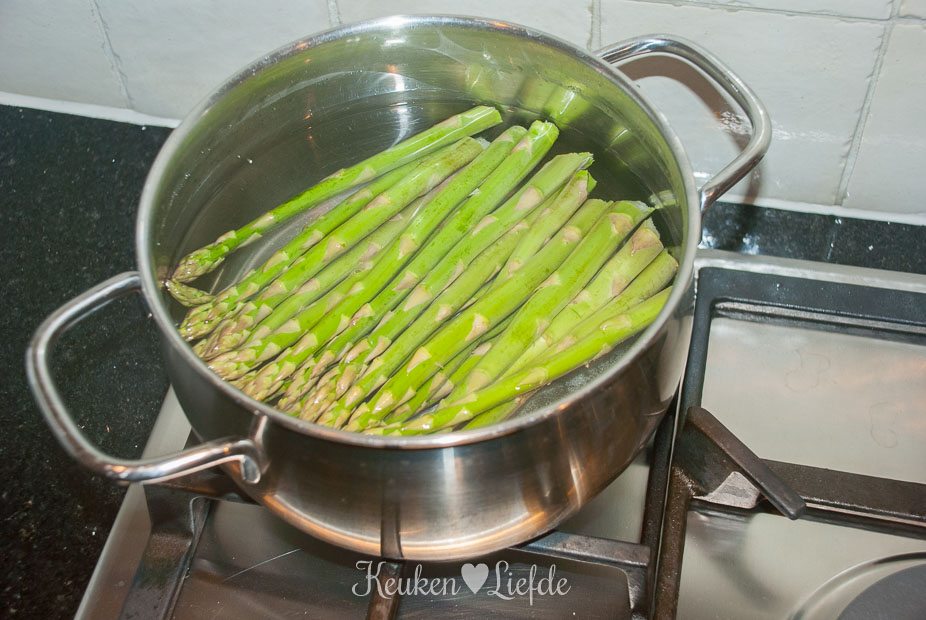 Vul ondertussen een kookpan met kokend water uit een waterkoker en voeg wat zout toe. Leg de deksel op de pan en breng het water opnieuw aan de kook. Breek het onderste harde gedeelte (circa 1 cm) van de groene asperges af. Dit gedeelte is niet lekker om te eten en gooien we weg. Je hoeft de asperges niet te schillen. Als het water kookt voeg je de asperges toe en kook ze 1 minuut. Giet ze af en laat ze uitlekken in een zeef.