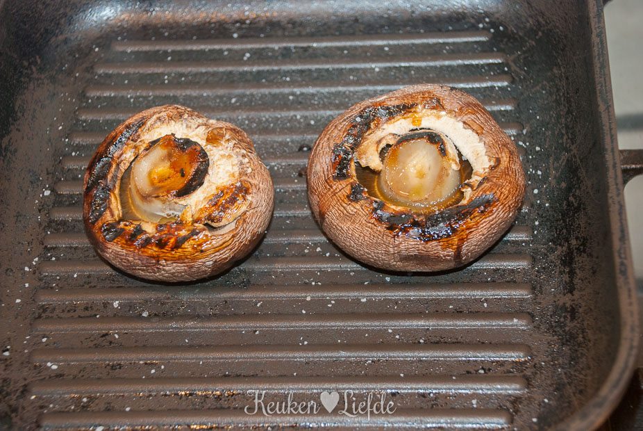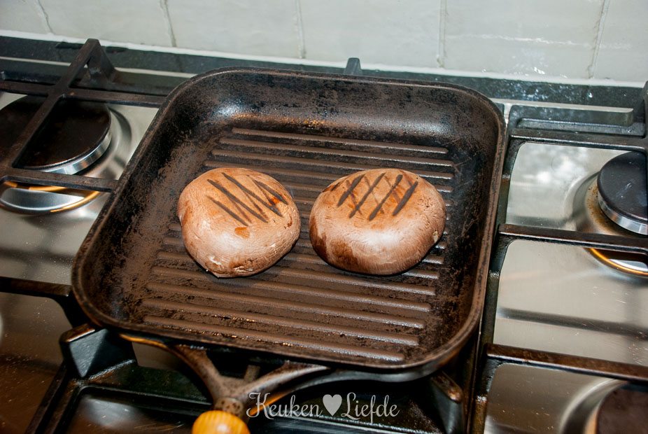 Verhit de grillpan en laat goed heet worden. Leg de portobello’s in de pan en grill ze aan elke kant, totdat ze mooie grillstrepen hebben en wat zachter zijn. leg ze op een bord en houd ze warm onder een stukje aluminiumfolie.