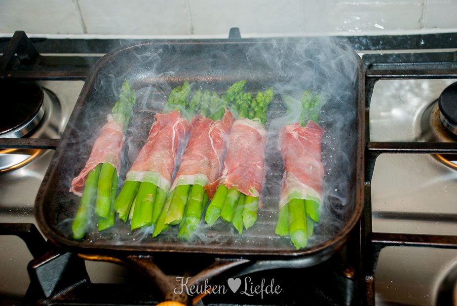 Omwikkel een aantal asperges in een plakje ham en grill ze in de grillpan, totdat de ham goudbruin en krokant is.