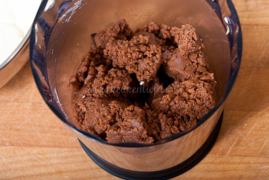Maal de koekjes in een keukenmachine tot fijne kruimels. Schep één eetlepel koekkruim uit de kom en houd achter voor garnering. Voeg de MonChou toe aan de overige kruimels en mix verder totdat er een stevige massa ontstaat. Vorm met je handen circa 25 balletjes van het deeg. Rollen lukt niet echt, dan vallen ze uit elkaar, dus knijp ze in je hand tot een bal.