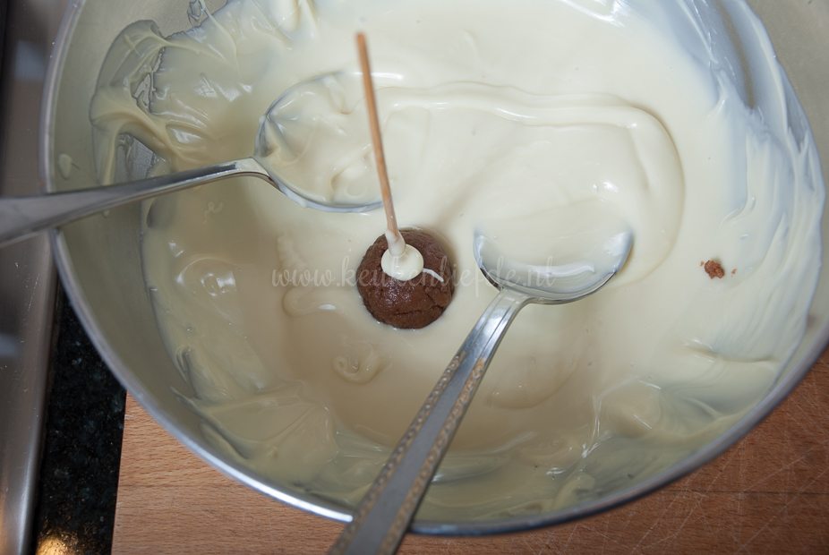 Dat is even een handigheidje dat je moet krijgen, ze vielen er bij mij soms ook af. Je kunt de balletjes ook gewoon met je hand in de gesmolten chocolade leggen en met een vork eruit halen. Dat is nog makkelijker! 😉