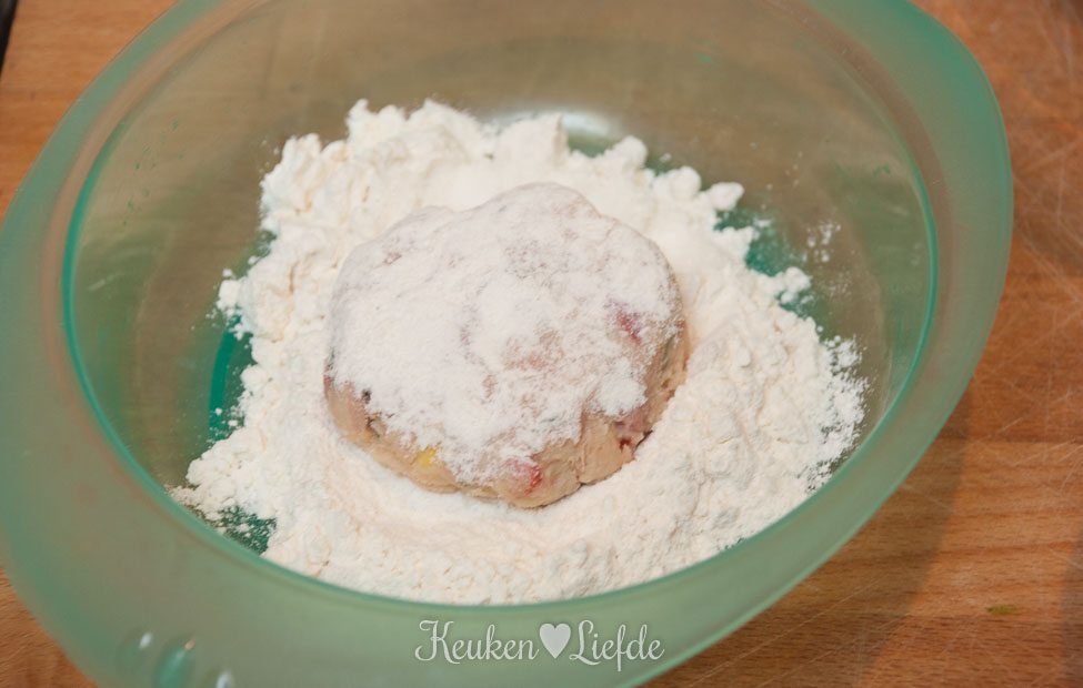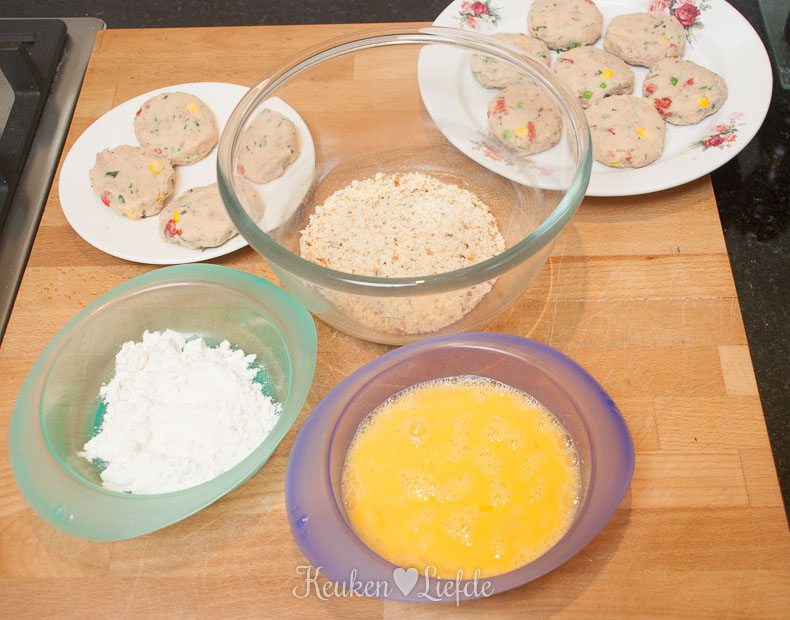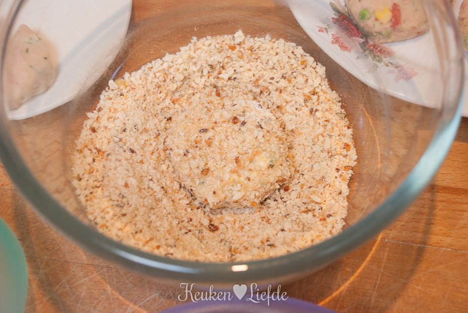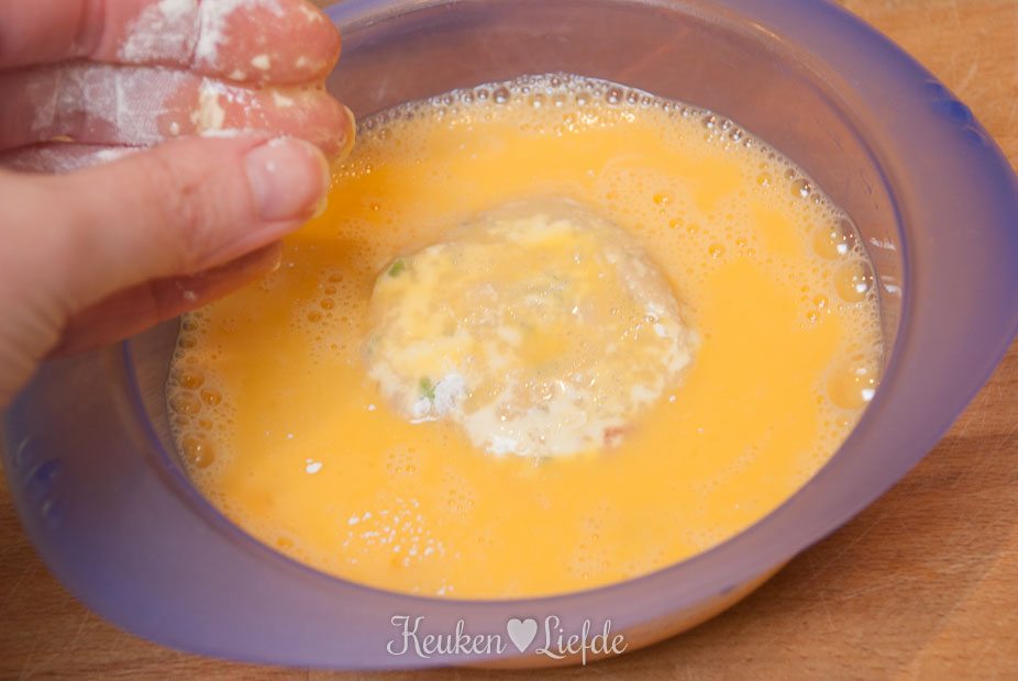 Zet drie borden klaar met losgeklopt ei, bloem en broodkruim. Wentel de koekjes eerst door de bloem, dan het ei en tot slot het broodkruim. Als de puree te zacht is, laat de koekjes dan eerst opstijven in de koelkast voordat je verder gaat.
