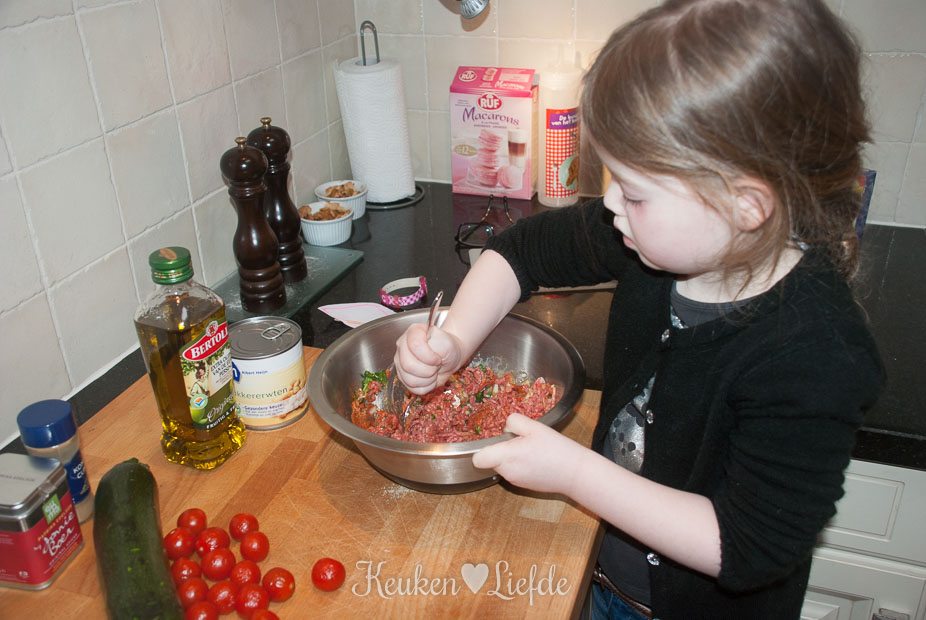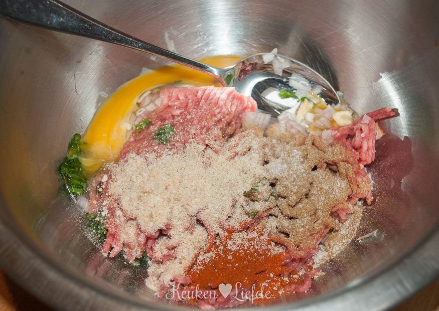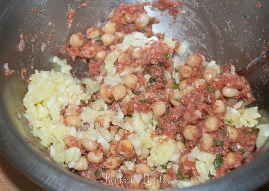 Meng in een kom het gehakt met de sjalot, knoflook, ei, paneermeel, paprikapoeder, komijn en peterselie. Roer de kikkererwten en de helft van het courgettevruchtvlees door het gehakt (de andere helft mag weg) en breng goed op smaak met zout en peper.