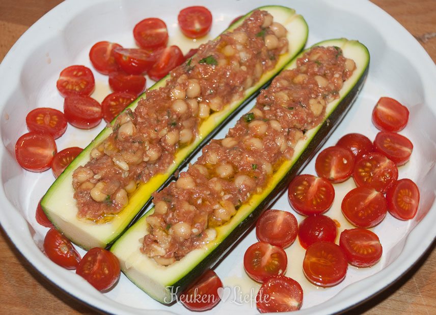 Vet de ovenschaal in met olie. Vul de courgettes met het gehaktmengsel en leg ze in de ovenschaal. Verdeel de cherrytomaten eromheen, besprenkel alles met wat olijfolie en giet een half kopje water over de cherrytomaten.
