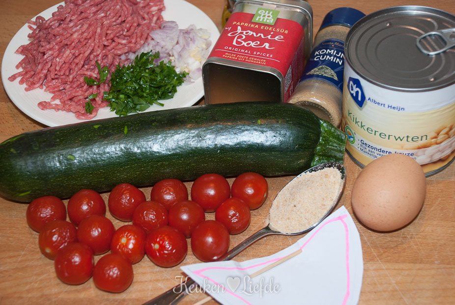 Meng in een kom het gehakt met de sjalot, knoflook, ei, paneermeel, paprikapoeder, komijn en peterselie. Roer de kikkererwten en de helft van het courgettevruchtvlees door het gehakt (de andere helft mag weg) en breng goed op smaak met zout en peper.
